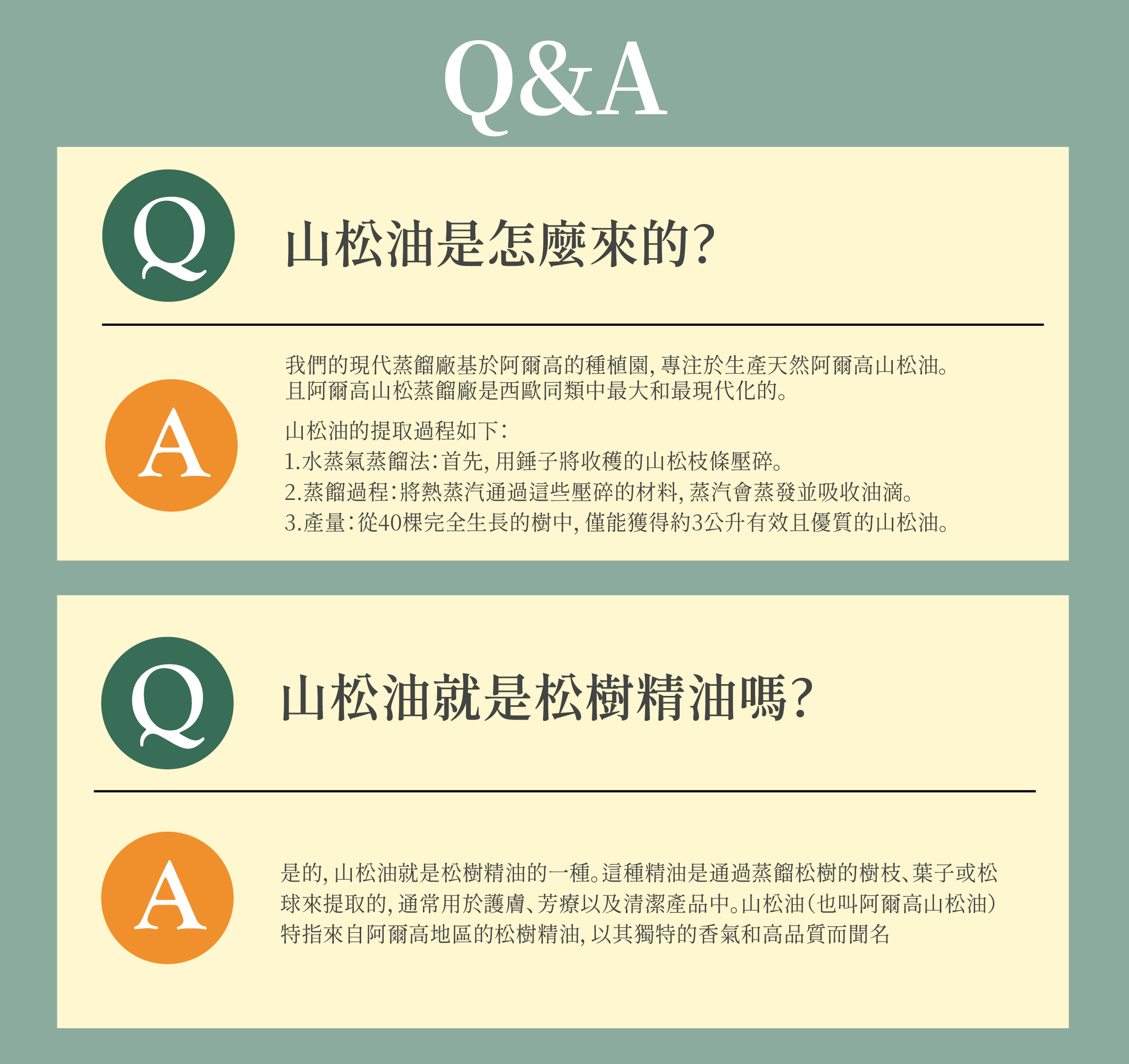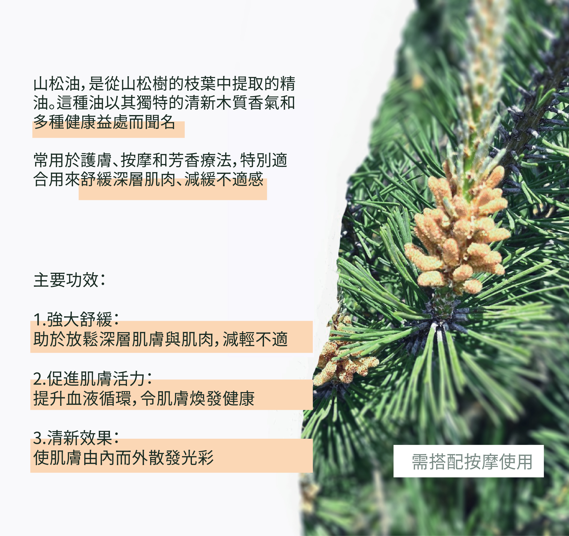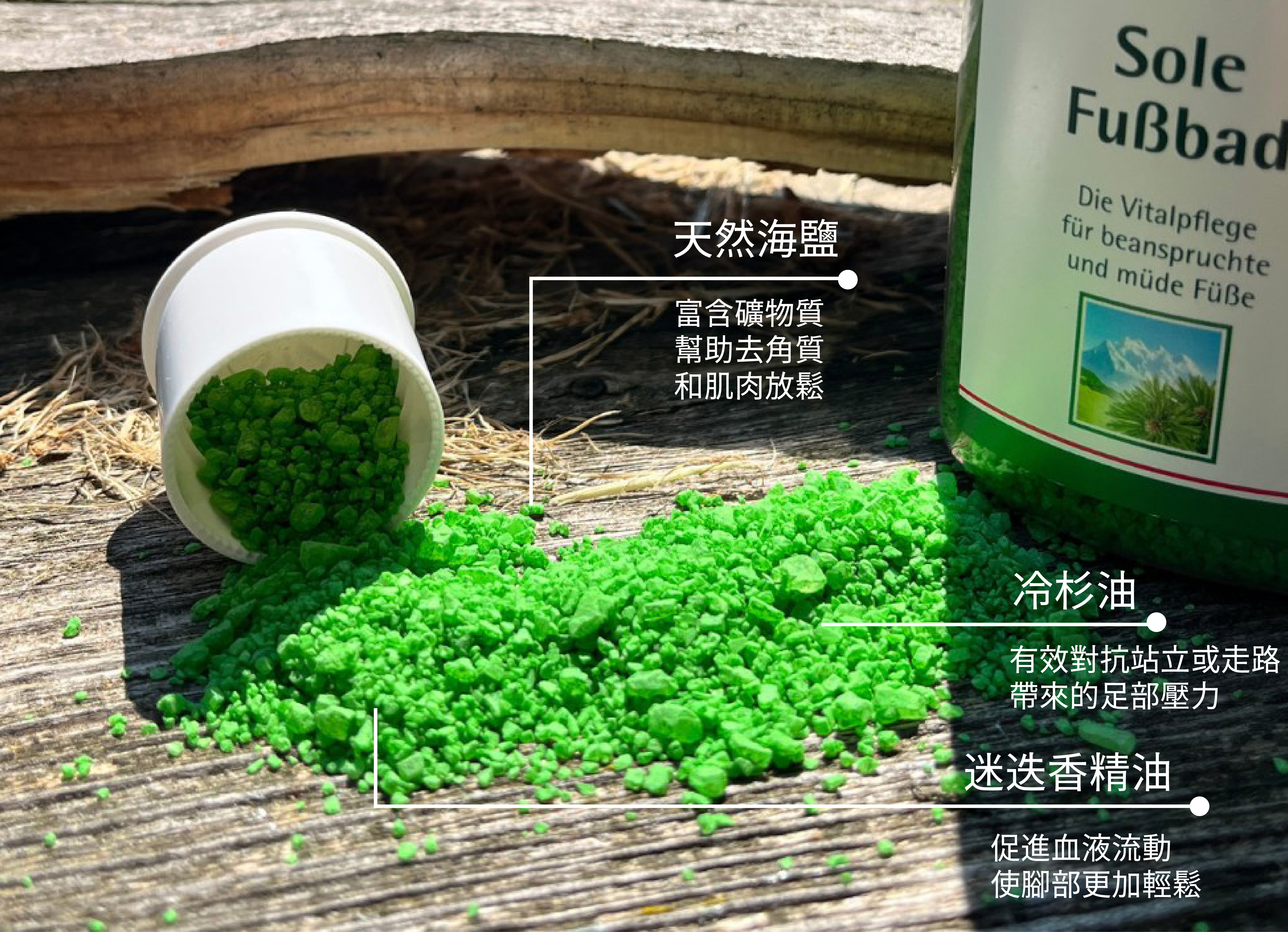 含有德國阿爾高山松樹精油、天然海鹽、冷杉油、迷迭香精油及維生素E。