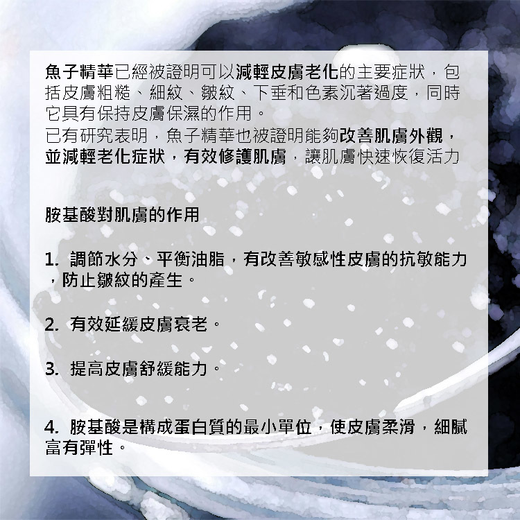 - 魚子醬豐富的成分-氨基酸、礦物質和微量元素有助於保濕和舒緩。