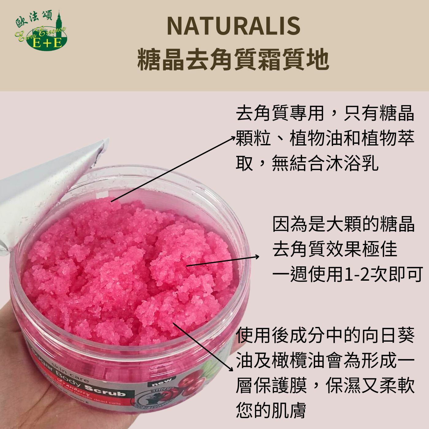 這款糖晶去角質霜中的其他重要成分包括向日葵油和橄欖油,它們可以完美地軟化皮膚,使其如絲般柔軟。