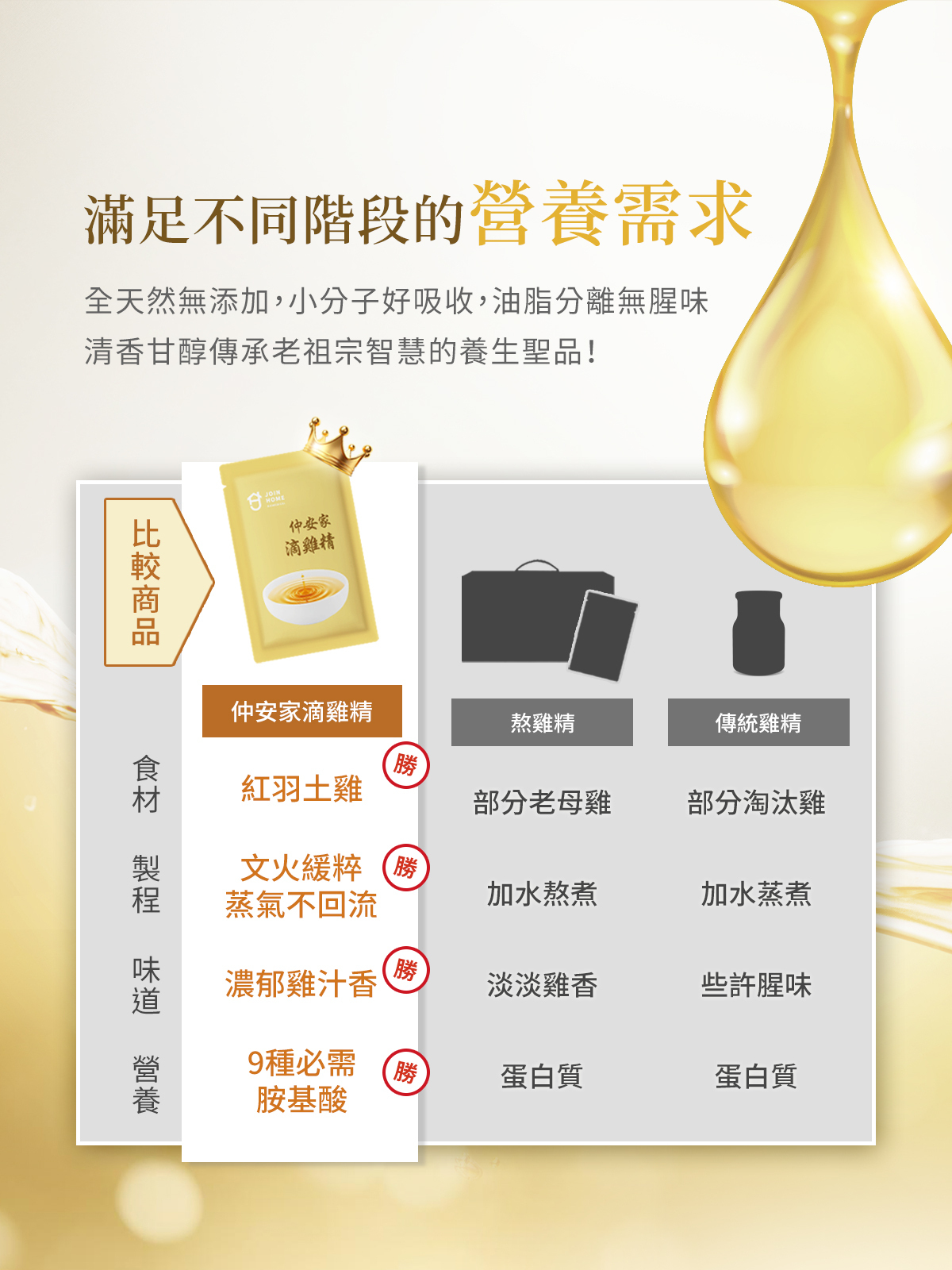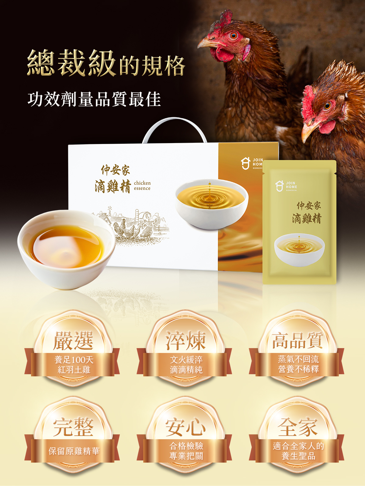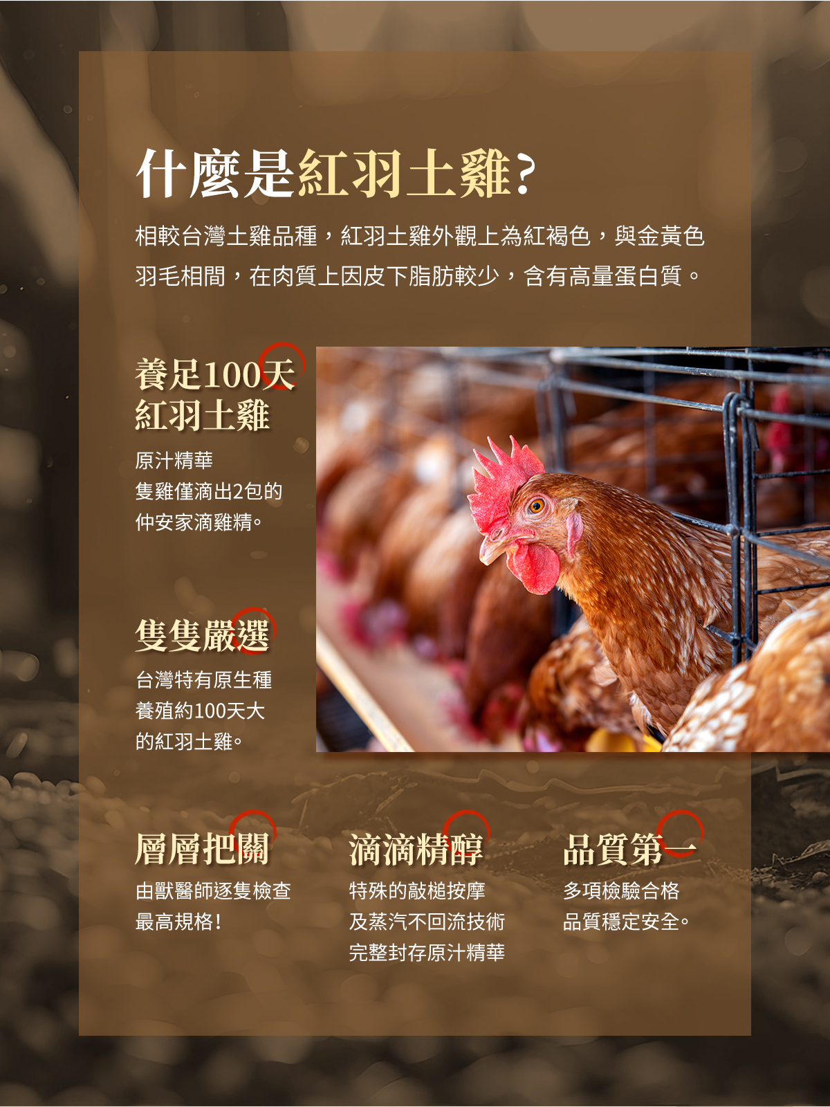 嚴選台灣原生種養足100天的黑羽土雞,100%完全不加水,經過9小時文火緩萃,並以高科技蒸氣不回流的方式保留滴滴香醇營養的雞精,