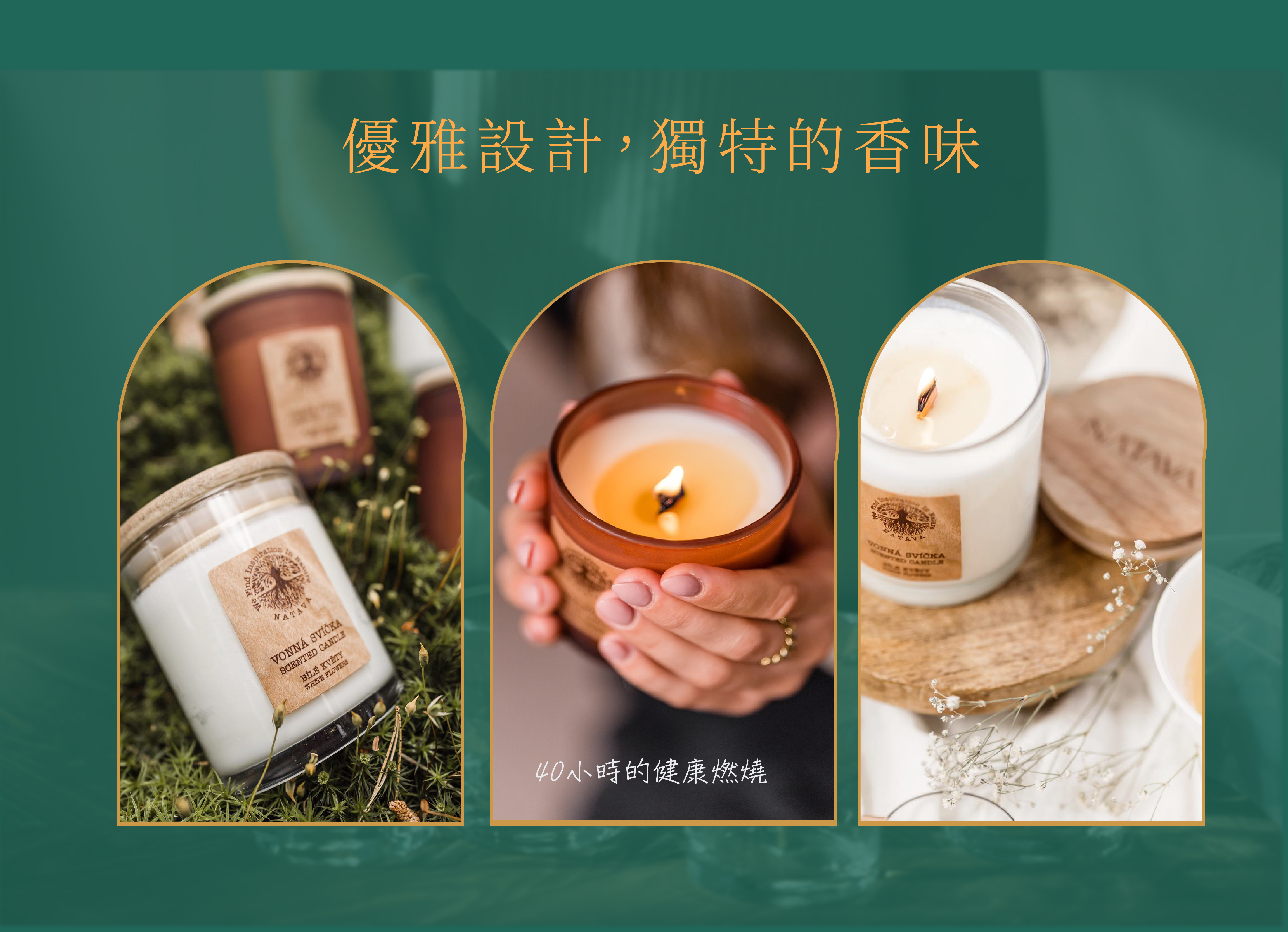 NATAVA香氛蠟燭由大豆蠟製成 ,配有木質燭芯,不會像傳統石蠟蠟燭那樣對您的健康有害,並且可以顯著延長蠟燭的使用壽命。